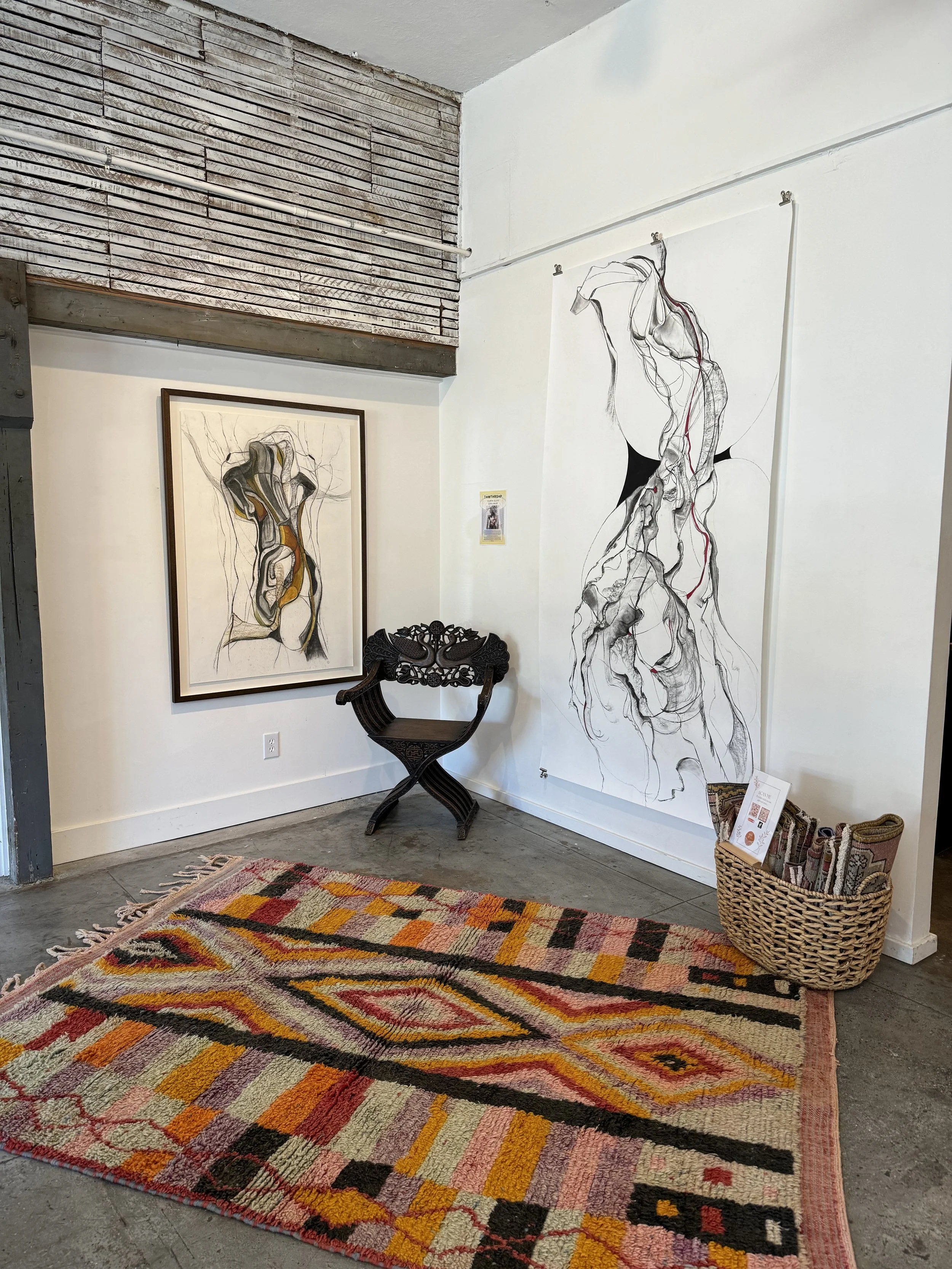 Dawn Elise Edelman is a mother, acupuncturist, and creative. She cherishes the moments when she can exist in a world without time or construct so she can feel the forces of Nature at play. It is in these moments that Dawn visually explores how the energy of our bodies interacts with the world around us, how it moves and transforms. Within our physical structure, is this energy open and spacious or dense and restrictive? She has sensed what we were before, and feels the density and its implications now, drawing large deconstructed bodies that exist without preconceived notions or boundaries. Her creative process leans into movement as she continually draws, erases, and draws again, carving out the path to a completed piece.