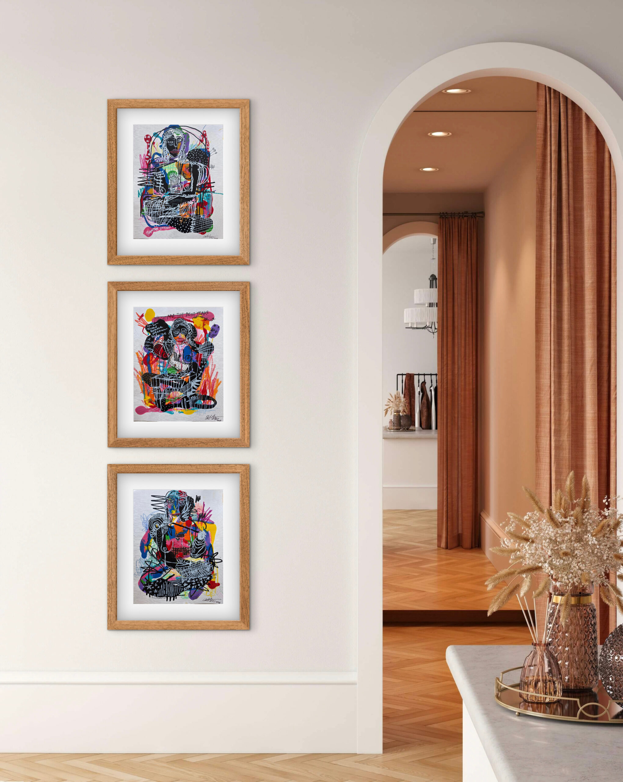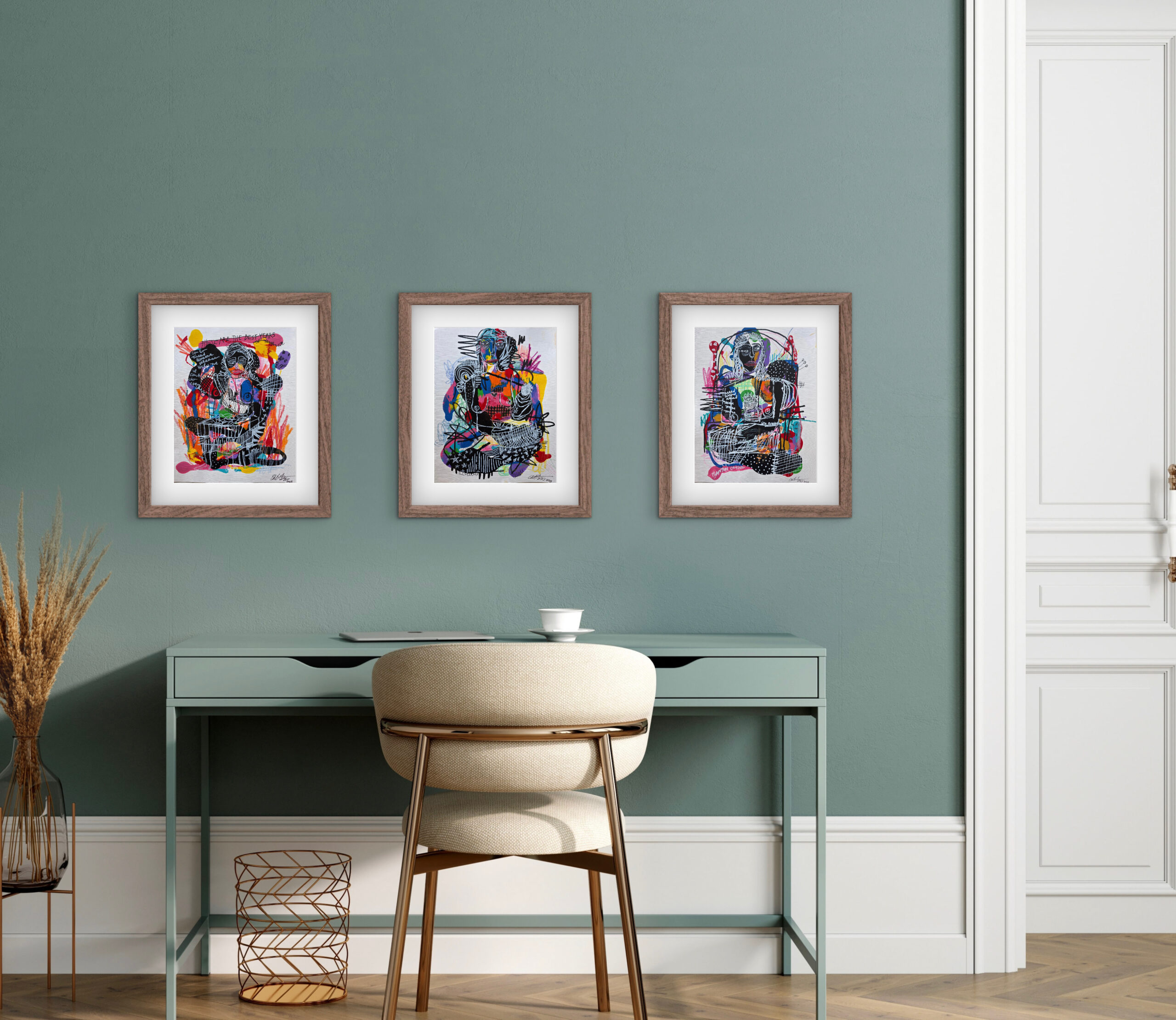“I discovered Catrina’s work on Instagram, after a fellow artist and friend directed me to her. I watched a video of her passionately painting with a baby strapped to her chest and I thought, ‘I need to know this woman.’ Over the past few years, Catrina and I have enjoyed a trusted working relationship built on mutual respect and admiration. I often describe her as a force of nature. She is as kind as she is fierce, intensely witty and sharp, and these characteristics carry over directly into her work where she channels complex emotions through movement, form, and color. Her signature Faces collection featuring an abstract expressionist style are offered here at a very affordable price. We will soon be showing more of her coveted stylized figurative work and offering prints of her Motherload and Tarot series.”-thMTHRshp Gallery Director, Liz Jordan.